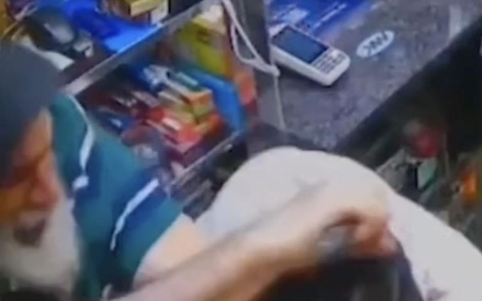 Security video shows Simon shoving Alba into product shelves, after which Alba — sporting a baseball cap, glasses, and a white mustache and beard — appears to slide down the shelves into a seated position.