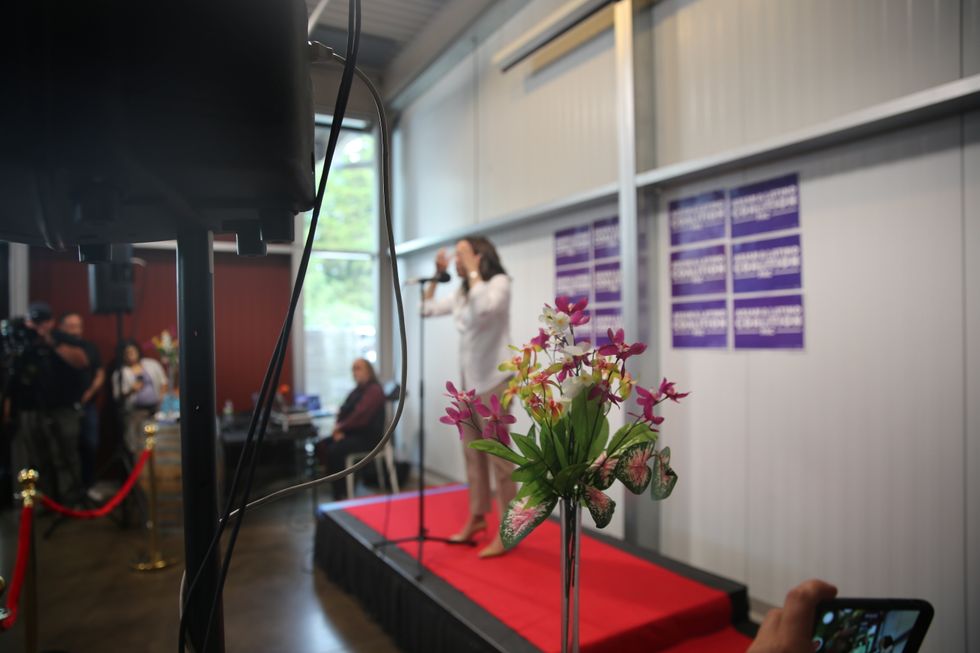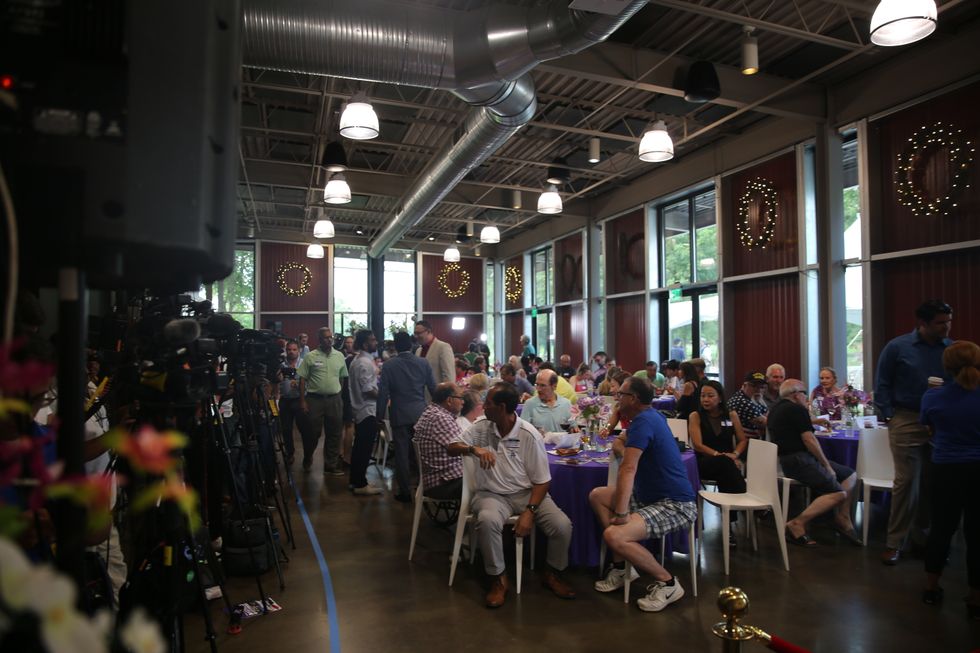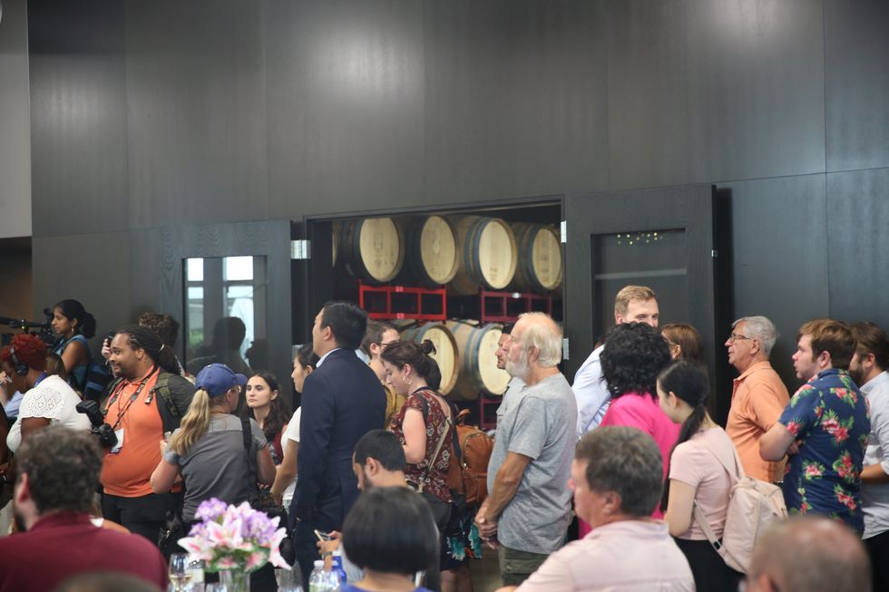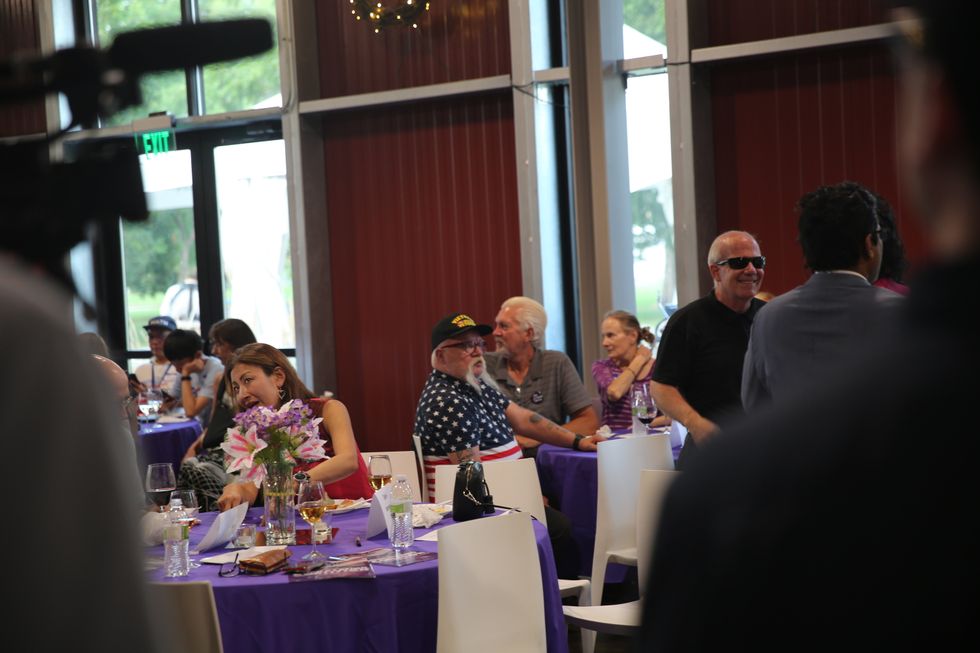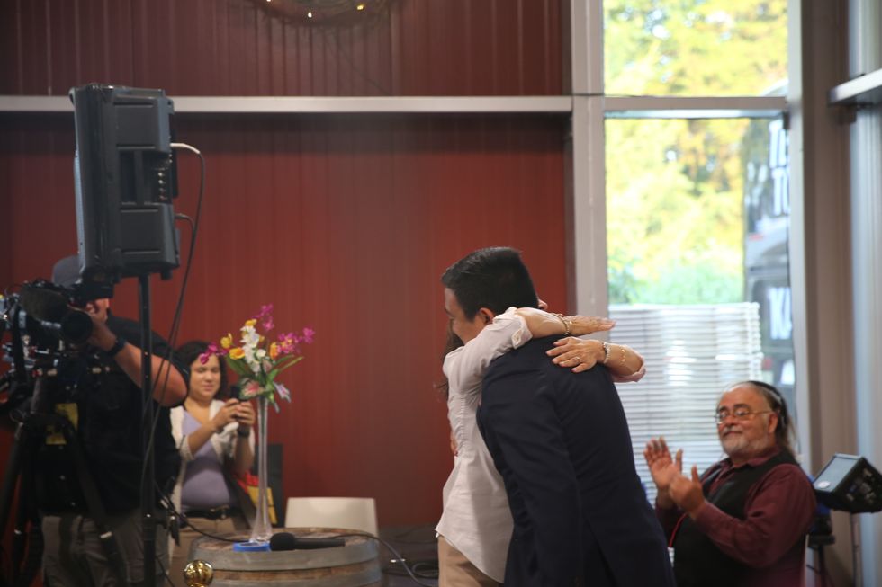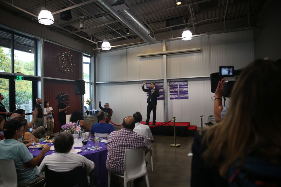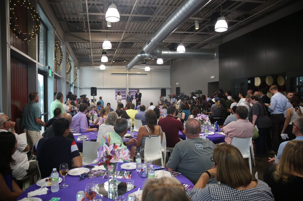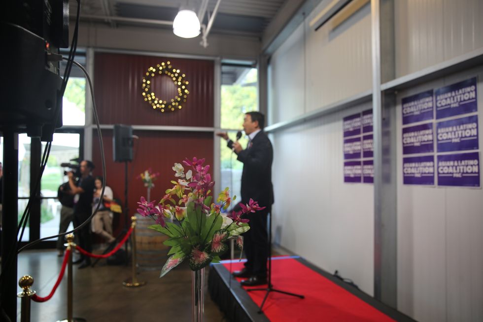 At Jasper Winery, Yang stood near the back of the crowd. People seated at tables draped with violet cloth and people standing or leaning against the tall, wide windows along the slink building.