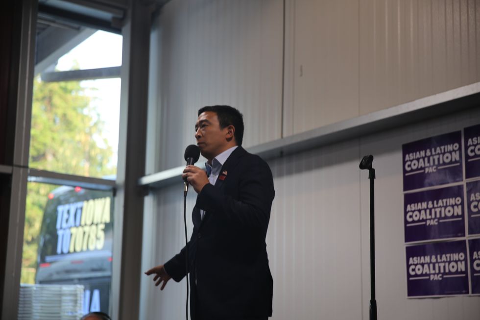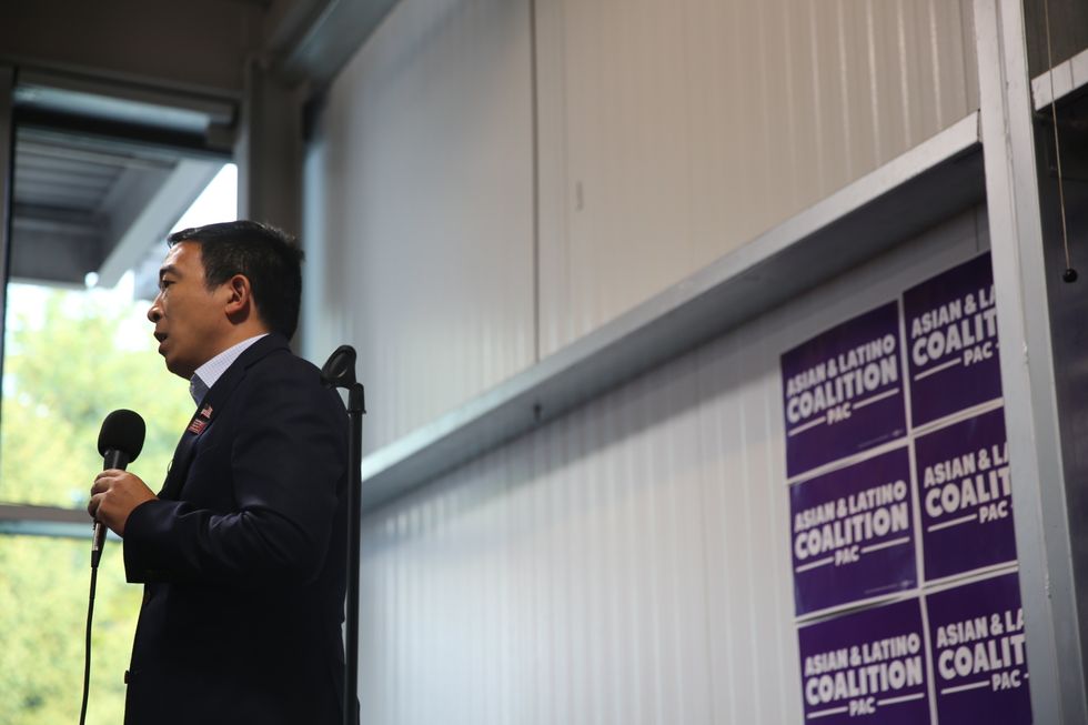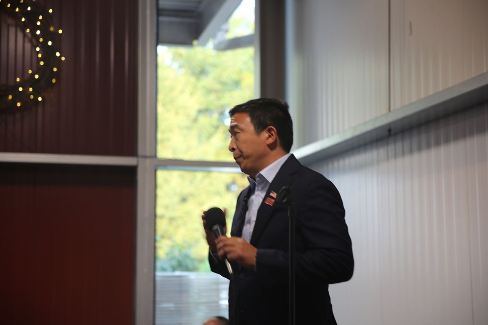 And she took half the place with her. More, maybe. Half of the audience. And since most of the media were there for her speech, most of them followed. Loudly. They were breaking down camera rigs and shuffling, all as Andrew Yang spoke.