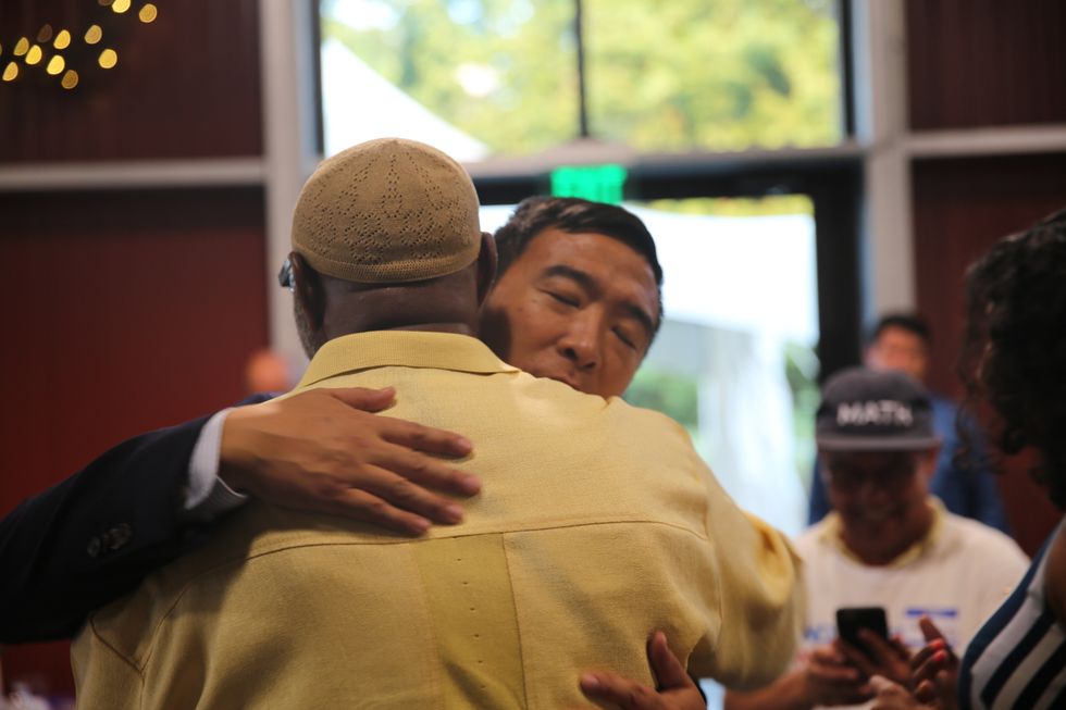 Yang wove through the narrow room and took the stage like it was a familiar blanket. Right away, he addressed Harris. She leapt up from her seat, they hugged. Harris initiated, head to the left. She often closes her eyes when she hugs. Yang, too. This time Harris kept her eyes open.