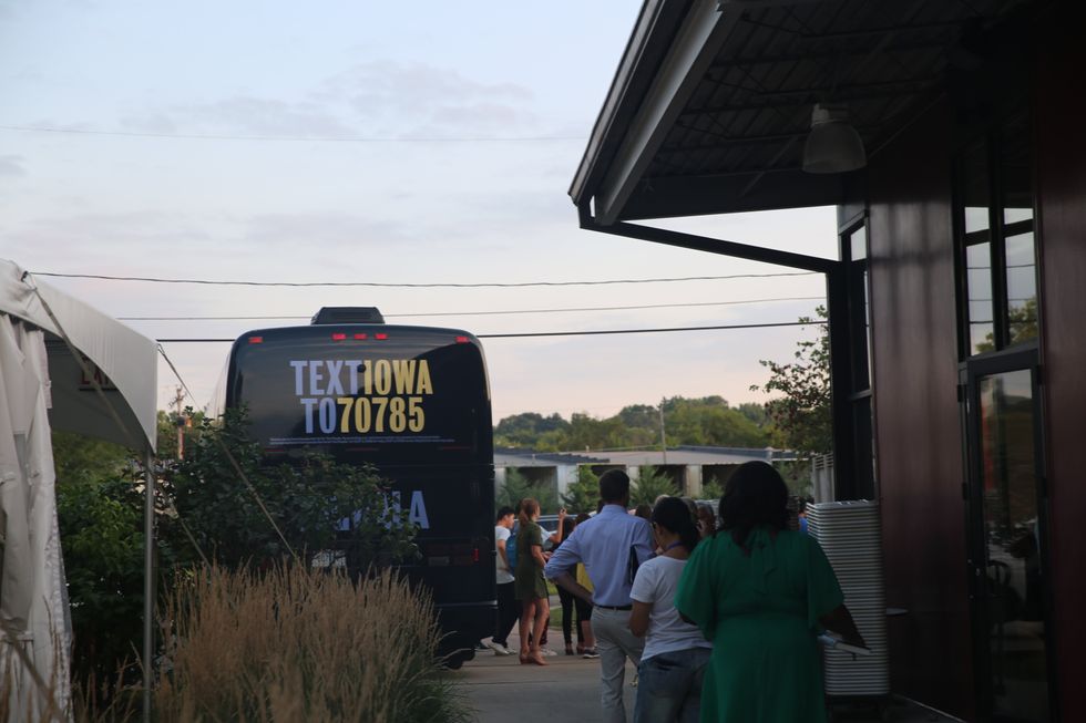 Harris' bus was just outside the door next to the stage. The winery had giant windows along all the walls, so no matter where you were in the room, you could see the back of Harris' bus, "TEXT IOWA TO 70785."