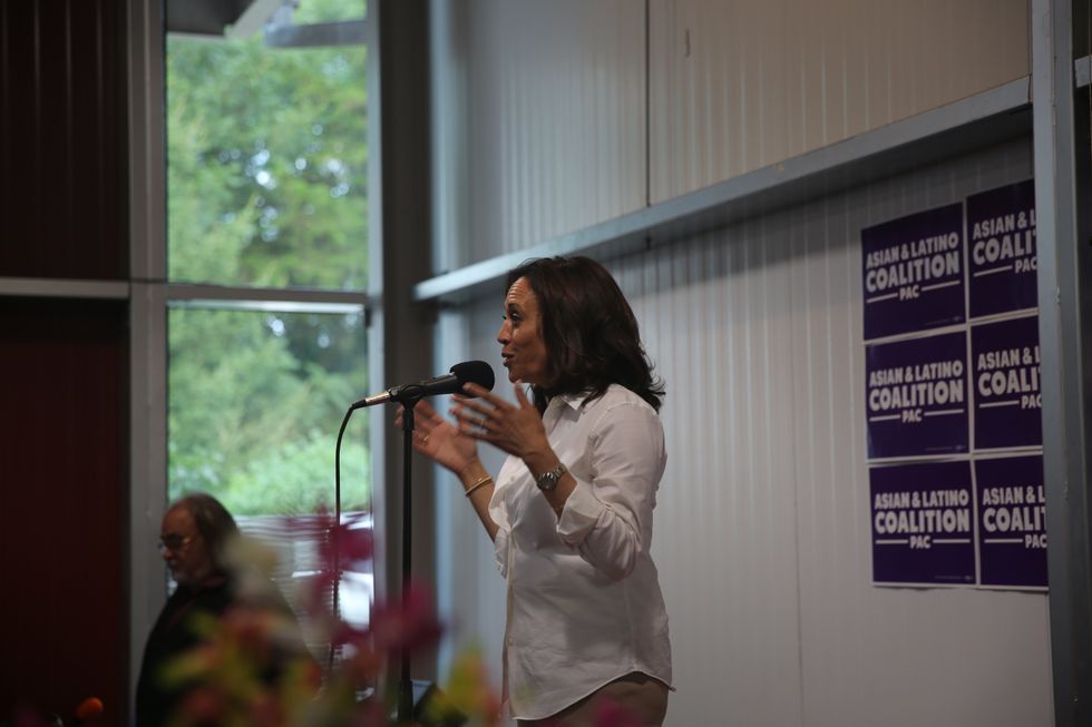 As the crowd settled, the Asian & Latino Coalition president took the stage beside Harris. After some jocular banter, he handed her an envelope, donations of some kind, or maybe a letter — the guy was hard to understand — and would she symbolically place it in this wicker basket?