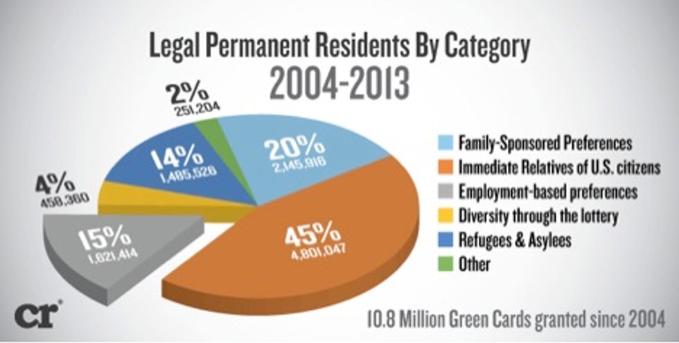 But these candidates are also slowly coming to the realization, at least publicly, that our immigration system is too heavily weighted towards low skilled individuals largely from the third-world. Almost 11 million immigrants have been granted green cards from 2004-2013 – more than at any other time in history – yet just 15% of those green cards were granted based on any measure of skills. Just 1.6 million of the 10.8 million legal permanent residents over the past decade were granted legal entry through employment-based preferences. As depicted below in the pie graph, the other 85% come from family-based ties, refugee and asylum, and the diversity visa lottery.