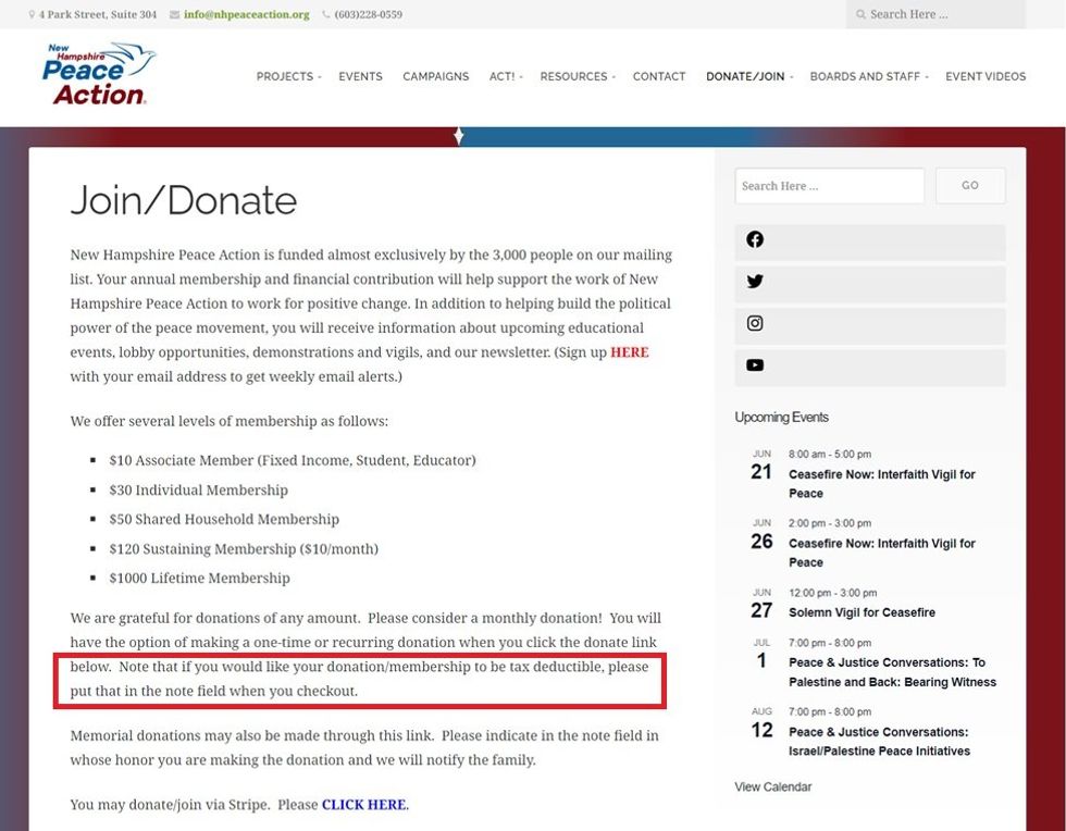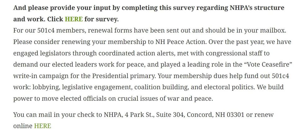 Some of the confusion may stem from yet another NHPA-related organization — New Hampshire Peace Action Education Fund — that is a verifiable 501(c)(3) but that seems to have no public-facing presence outside NHPA. A quick search for such an "education fund" on the NHPA website directs users to the board of directors, many of whom seem to serve NHPA and NHPAEF concurrently. Otherwise, New Hampshire Peace Action Education Fund has no other unique page on the NHPA website.