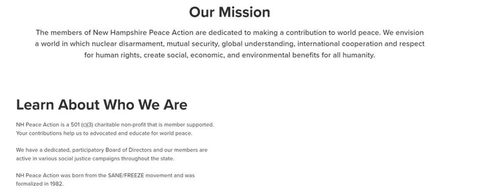 On the surface, New Hampshire Peace Action seems like a traditional left-leaning antinuclear organization, mainly advocating nonviolence and claiming to want to engage in peaceful, respectful protest and community dialogue. On its website, NHPA envisions building "a more peaceful and just future for all" by promoting "international relations ... based on cooperation instead of competition and conflict."