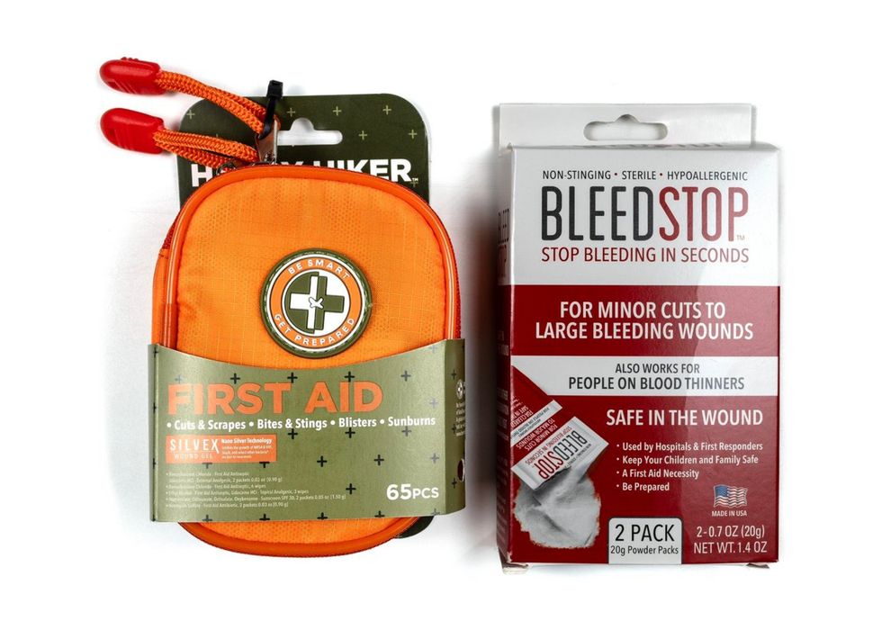 Again, there are better options, but this is fairly decent for an extreme budget: BleedStop and a basic first aid kit.