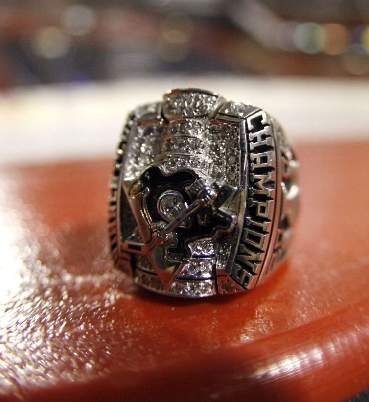 The rings represent all three of Malkin's championships, which he won with the Penguins in 2009 (pictured below), 2016, and 2017.