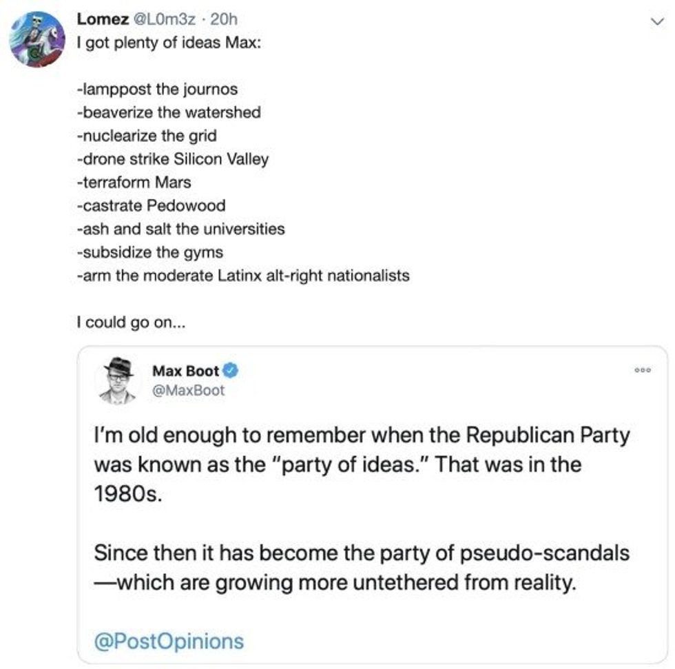 Wilson links to the same post in his article, quoting the first entry in the list and soberly describing it as "an apparent call for summary lynchings of members of the media." He fails to quote any subsequent entries, however, leaving the reader to wonder if he regards proposals to "beaverize the watershed" and "arm the moderate alt-right Latinx nationalists" as little more than idle japes.